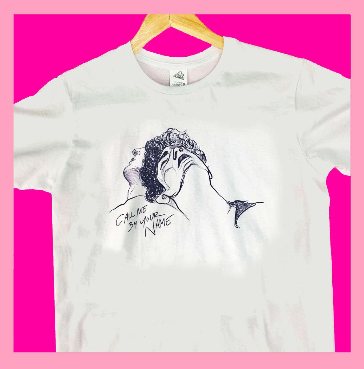 Elio es un chico judío italiano-estadounidense de diecisiete años, que vive en el campo italiano con sus padres durante el verano y las Fiestas. Su padre, profesor de arqueología, invita a un estudiante de posgrado, Oliver, judío estadounidense, a vivir con su familia durante el verano de 1983 y ayudarlo con su documentación académica. Camiseta con una ilustración de un artista tributo a la pelicula que cambió a una generación.